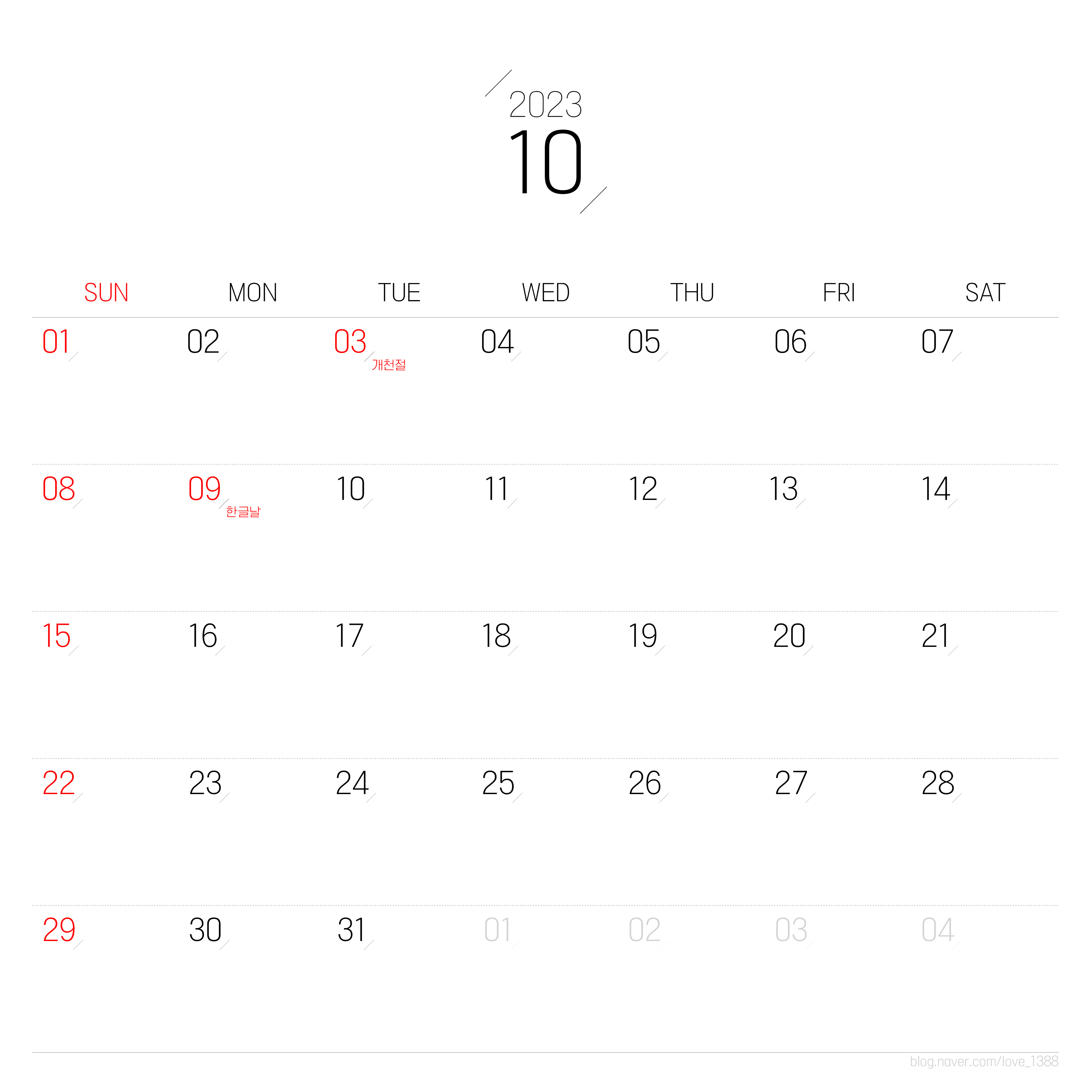 10월은 앞서 이야기한 3일의 개천절이 있다. 3일의 연계 콤보는 1년 중 가장 휴가를 쓰기 좋은 기간일 것이다. 혹시 해외여행의 일정이 있다면 빠른 예약을 필수 일 것이다. 9일 한글날도 월요일이 휴일이어서 추가 휴가를 쓰지 않아도 3일의 휴식을 할 수 있다.