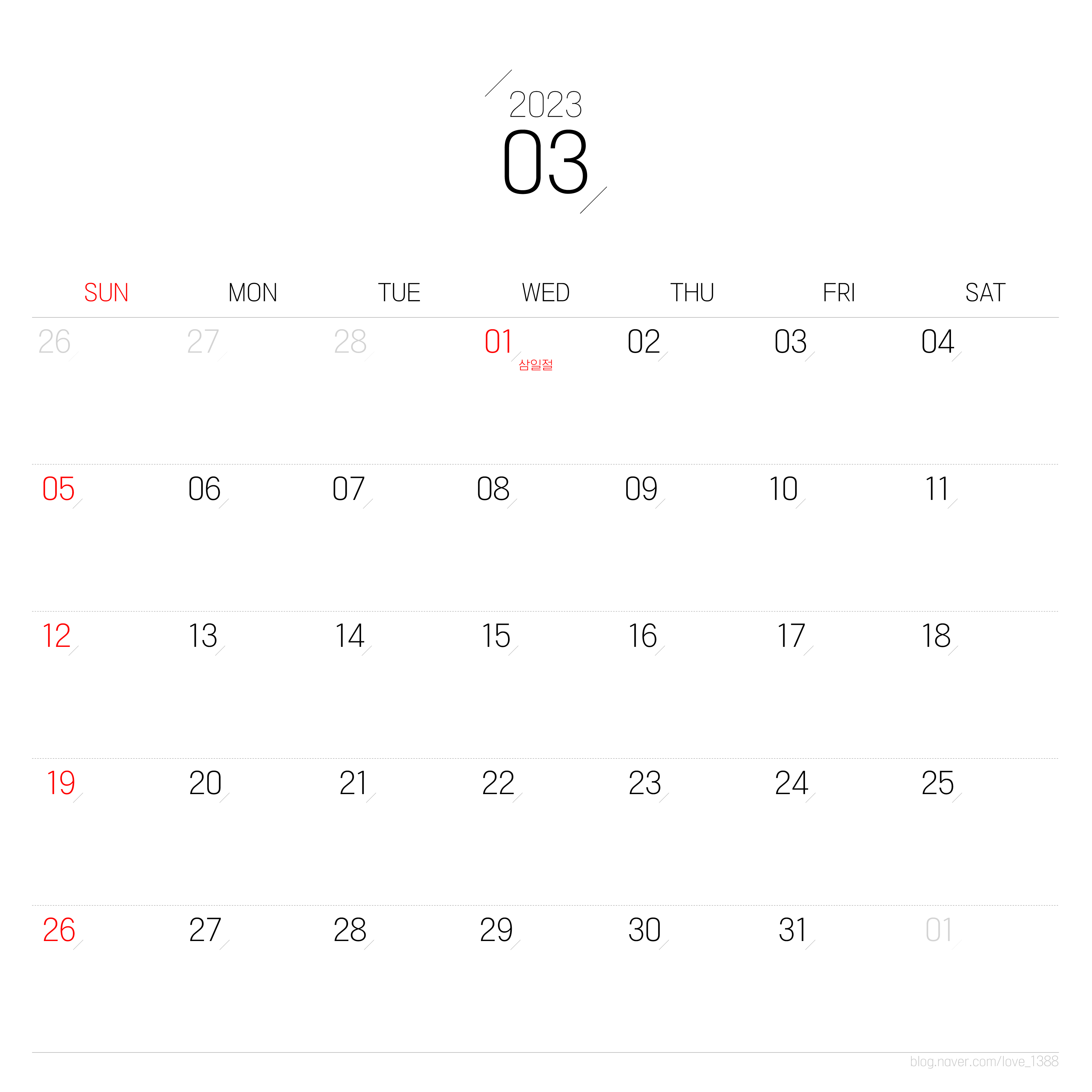 3월은 1일 삼일절 하루가 휴일이다. 수요일이어서 휴가를 붙이기에는 애매하지만 2일 휴가를 쓴다면 5일 휴식이 가능하겠다.