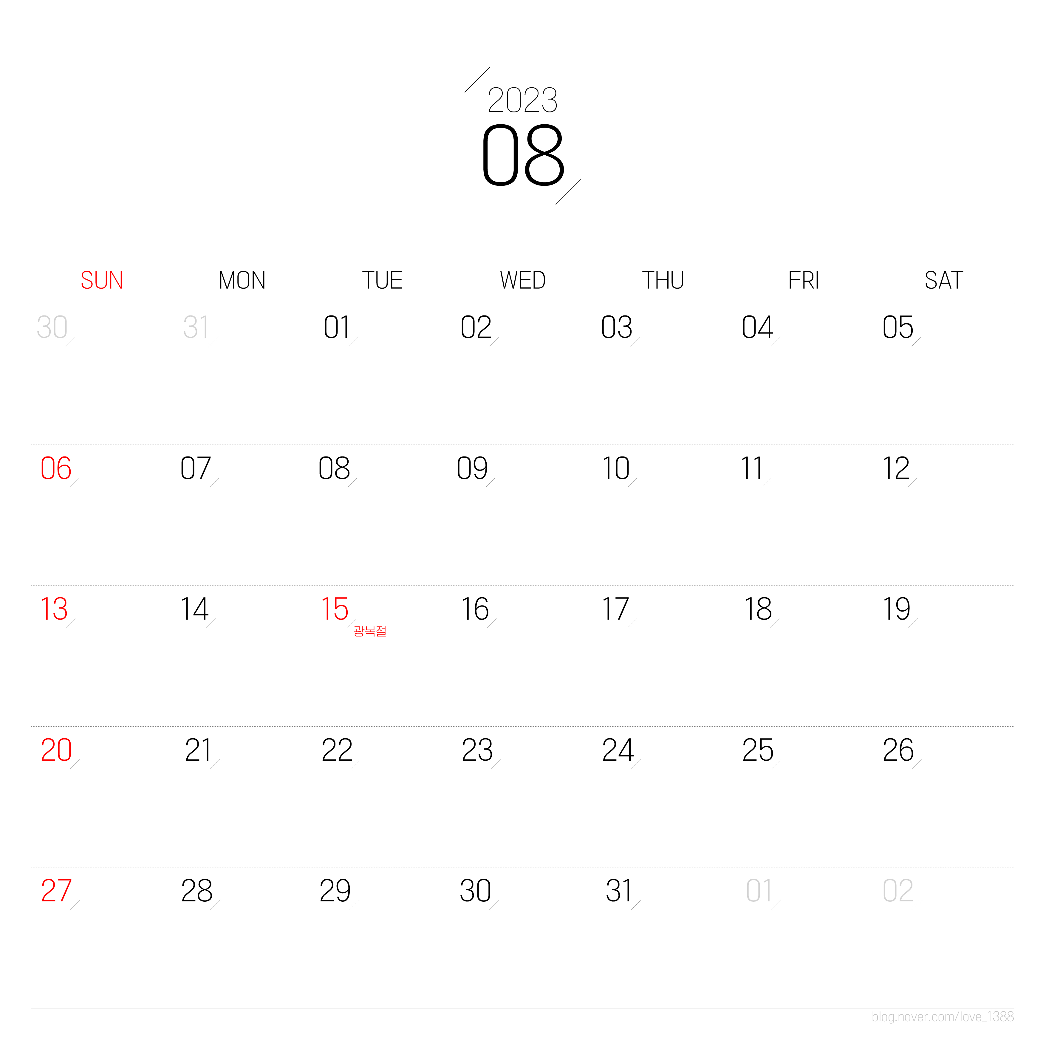 8월에는 15일 광복절이 화요일 휴일이다. 따라서 14일 하루 휴가가 가능하다면 4일간 연휴가 가능하다. 혹시 여름휴가를 계획하고 있다면 16일 에서 18일도 추가로 쓴다면 해외여행 일정도 가능하다. 하지만 해당기간에 가장 여름휴가가 많고 가격은 비쌀 것으로 예상된다.
