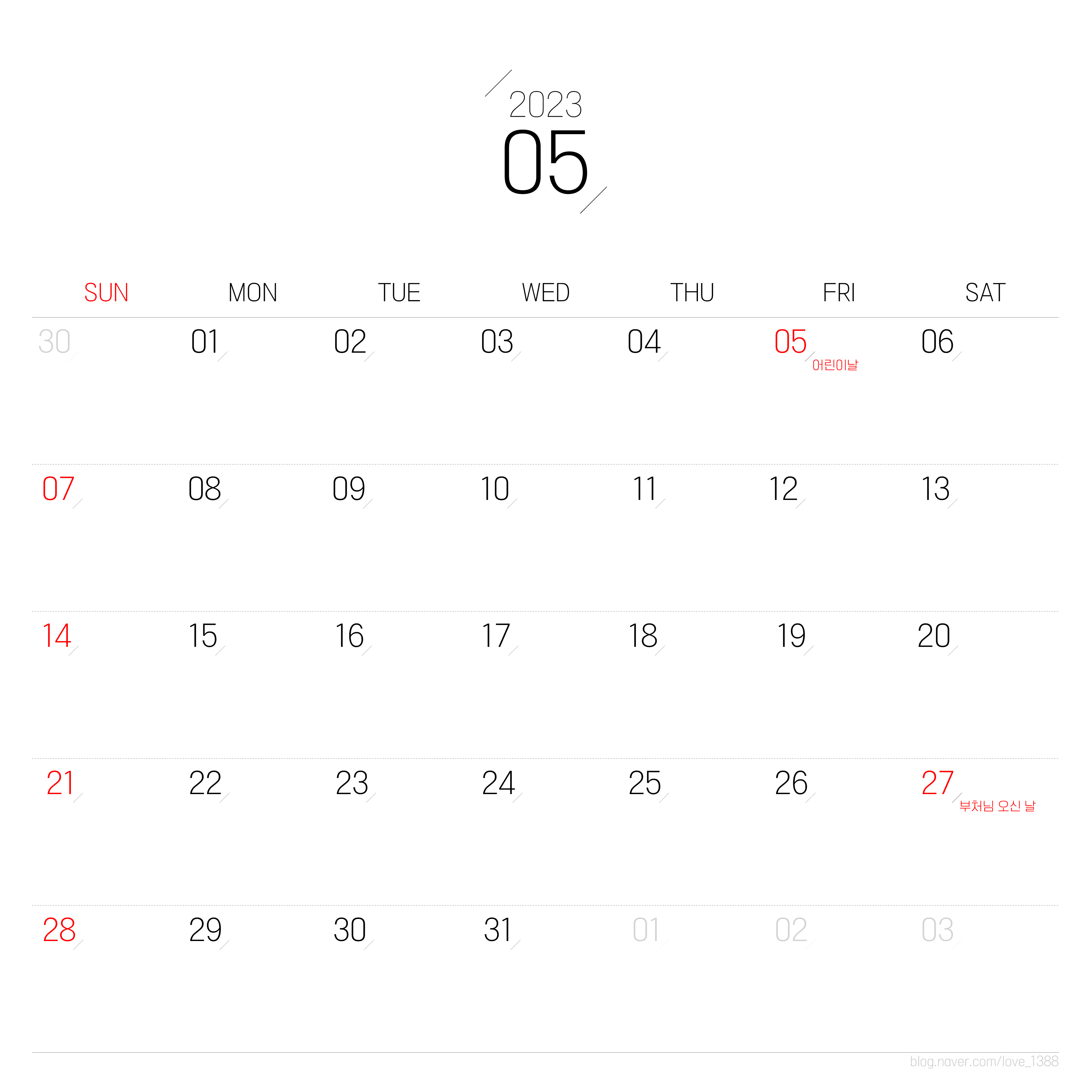 5월은 근로자 한정 휴일인 1일 근로자의 날이 있다. 5일에는 어린이날이 금요일에 있어 휴가를 쓰지 않고도 3일의 연휴가 주어진다. 부처님오신날인 27일은 아쉽게도 토요일로 대체휴일이 적용되지 않는다.