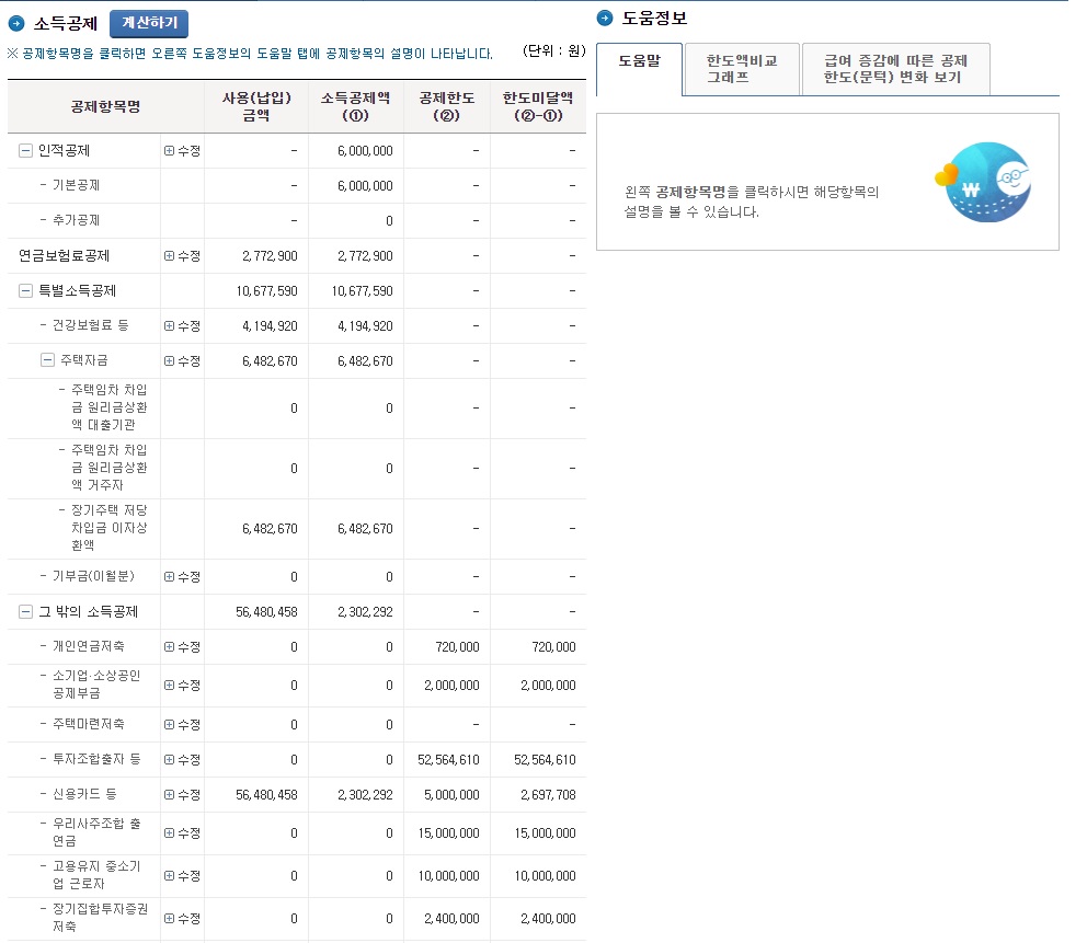 연말정산 미리보기 서비스의 하이라이트 연말정산을 모의고사로 볼 수 있는 곳이다. 해당 단계에서 나에게 맞는 각종 공제항목들을 체크해보고 입력하여보고 올해는 환급을 받을 수 있을지, 뱉어내야 할지 확인 할 수 있는 곳이다. 따라서 각종 공제 항목들에 대해서 확인해보고 입력하여 올해의 예상금액을 산출하여 보자.
