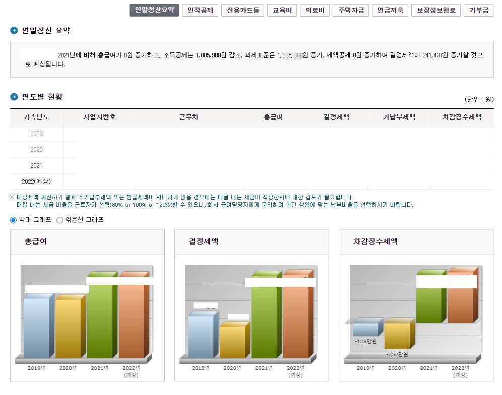 생각보다 많이 유용한 정보여서 필자도 놀란 서비스이다. 3개년 추이를 보여주며 내가 어떤 항목에서 연말정산을 제대로 받았는지 못받았는지 한눈에 파악하게 해주며 절세의 TIP까지 챙겨주고 있다.